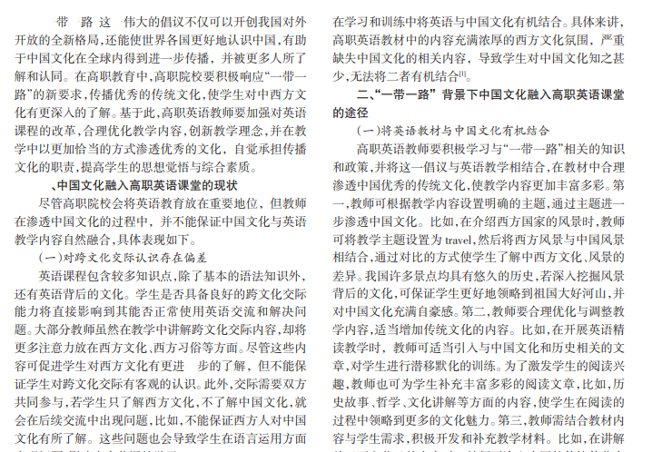在“一带一路”背景下,为了进一步弘扬中国优秀的传统文化,使沿线国家和世界各地的人民了解中国文化,要选择恰当的文化传播载体。高职院校要积极响应“一带一路”倡议,改革与创新英语教学,在教育中合理渗透我国优秀文化,打造全新的英语教育体系,使学生在学习英语的同时,感受到我国文化的魅力,并学会用英语阐述我国文化的内涵、背景,提高学生的跨文化交际能力。