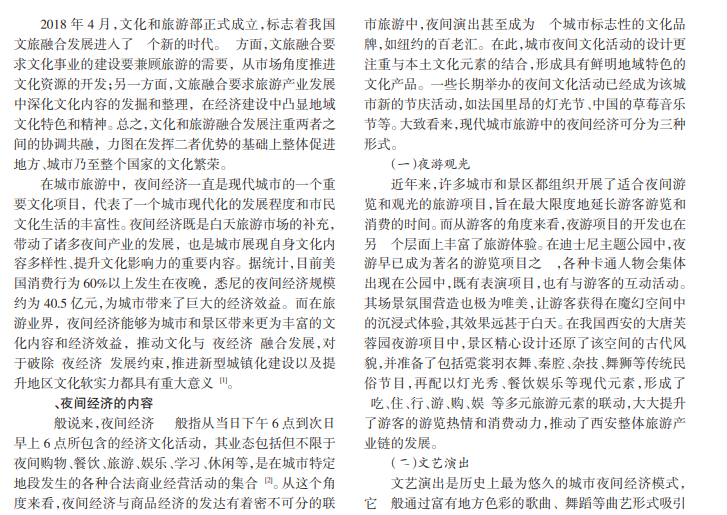 在当前文化融合发展中,夜间文化活动已经渐渐成为城市和景区彰显自身文化形象,推动旅游经济发展的重要组成部分。本文分析了夜间旅游文化活动的主要类型和特点,并根据我国当前夜间经济发展的问题提出了未来繁荣夜间经济的主要路径。