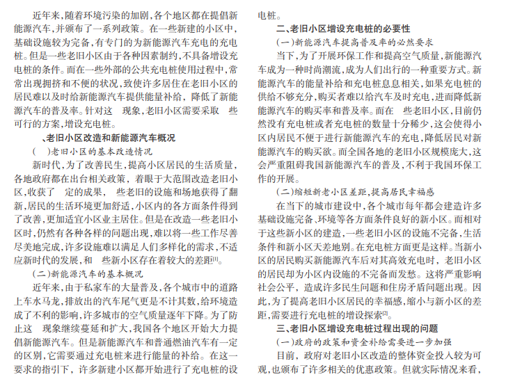 近代社会,科技和社会经济的飞速发展给环境带来了巨大的影响。尤其是汽车的广泛普及,让空气质量逐年下降。为了保护环境和改善空气质量,近年来国家大力提倡新能源汽车。就目前的基本情况来看,许多地方的老旧小区没有足够的条件增设充电桩,严重影响了新能源汽车的普及。小区设施的不完善成了许多新能源汽车购买者的后顾之忧,因此,相关的老旧小区需要整改,高效增设充电桩。本文从废弃锂电池的环保与回收管理研究出发,以青岛市黄岛区辛安街道新港小区为例,分析老旧小区增设充电桩的必要性、出现的问题以及应对举措。