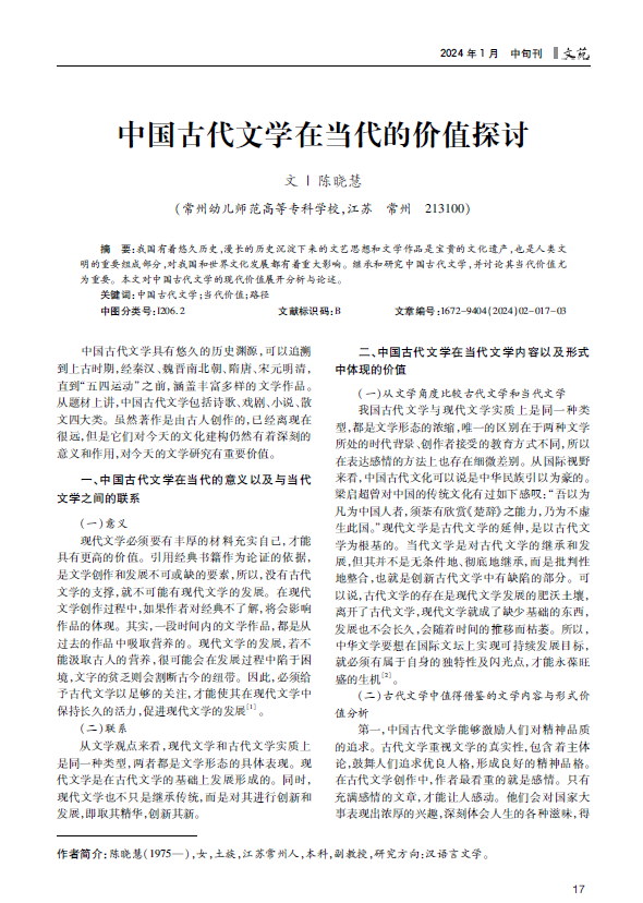 我国有着悠久历史,漫长的历史沉淀下来的文艺思想和文学作品是宝贵的文化遗产,也是人类文明的重要组成部分,对我国和世界文化发展都有着重大影响。继承和研究中国古代文学,并讨论其当代价值尤为重要。本文对中国古代文学的现代价值展开分析与论述。