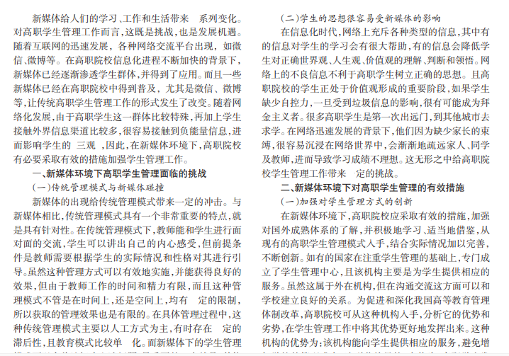 本文主要针对新媒体环境下高职学生管理的挑战和措施展开深入研究,先阐述了新媒体环境下高职学生管理面临的挑战,如传统管理模式与新媒体碰撞、学生的思想容易受新媒体的影响等;然后提出了几点切实可行的措施,主要包括加强对学生管理方式的创新、教师应做到与时俱进、注重对学生思想素质教育、通过新媒体技术对学生加以引导,进而为学生创设健康的校园环境,确保高职学生管理工作顺利实施,促进学生全面发展。