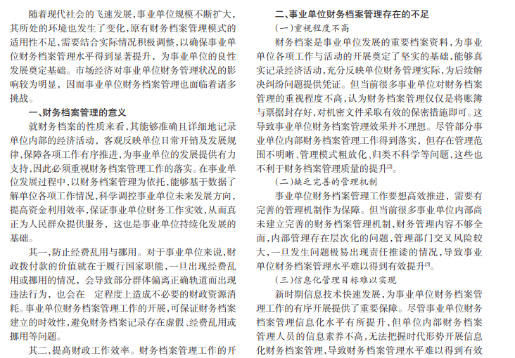 新时期事业单位改革逐步深化,为确保在社会发展中保持良好的适应性,需要加强财务档案管理,提高资金利用率,为自身发展提供保障。本文阐述事业单位财务档案管理的意义,分析事业单位财务档案管理存在的不足,进一步探究事业单位财务档案管理的有效策略,旨在为事业单位各项工作与活动的开展提供有效支持。