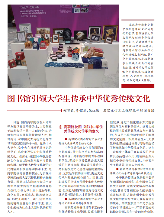 在大力传承和弘扬 中华优秀传统文化的时 代背景下,引领当代大学 生传承与创新中华优秀 传统文化,是时代赋予高 职院校的使命和要求。 高职图书馆作为知识文 化传播的主要阵地,推广 中华传统文化是培养大 学生民族文化自信的重 要途径,有助于大学生领 略中华传统文化蕴含的 思想、人文观念、道德规 范,培养爱国主义情怀。