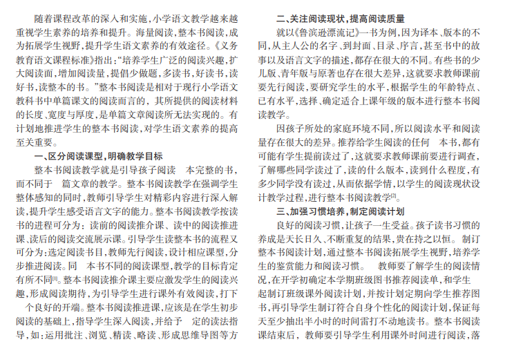 本文从“区分阅读课型,明确教学目标;关注阅读现状,提升阅读质量;加强习惯培养,制订阅读计划;推进三种课型,提升学生素养。”四个方面介绍了整本书阅读对学生素养提升的重要性。阅读推介课———激发兴趣,形成期待;阅读推进课———掌握方法,形成策略;阅读展示课———交流收获,概括提升。通过以上三种课型让学生在整本书阅读中,发展思维能力,提升语文素养,丰厚人生底蕴。