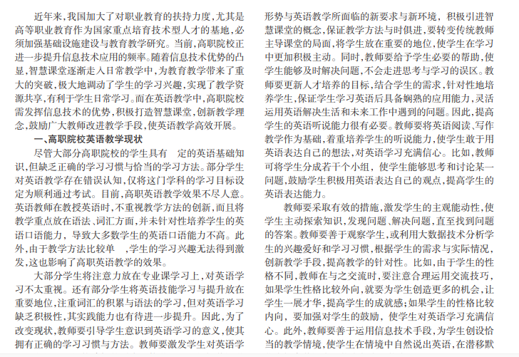 高职院校是培养复合型与技术型人才的摇篮,高职院校的教师应认真分析学生的具体学习情况,采取行之有效的教学策略,以提高学生的综合素质。为了提高学生的英语应用能力,高职院校要引进先进的技术,打造智慧英语课堂,英语教师也要积极创新教学方法,改革教学手段,提高学生英语学习的积极性和主动性。本文主要分析智慧英语课堂的构建,旨在弥补高职英语教学中存在的不足,为高职教育可持续发展提供更多参考依据。
