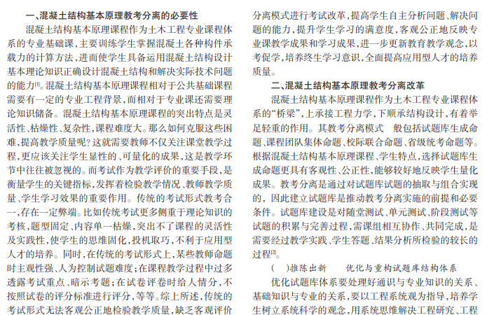 为进一步加强教学管理、深化教学管理、提高教学质量,让学生忙起来、让教师强起来、让管理严起来、让效果实起来,加强教风、学风建设,本文根据混凝土结构基本原理课程特点,分析教考分离的必要性,深探教考分离的方法与策略以及思政与德育教育在考核环节的渗透,从而增强学生自主学习能力和分析问题、解决问题的能力,进而促进教学质量的提高和培养德才兼备的工程技术人才目标的实现。
