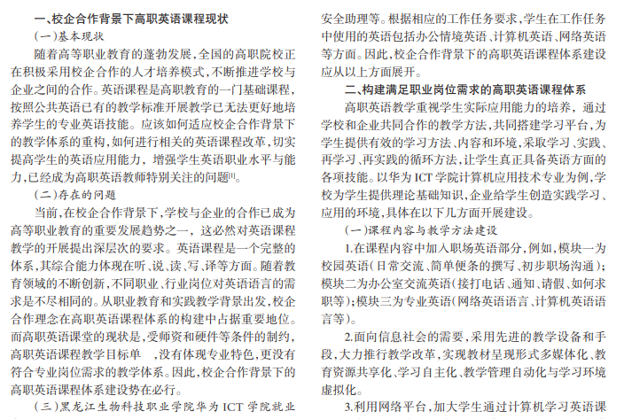 高职英语课程是高等职业教育的重要组成部分,为培养满足生产、建设、服务和管理第一线需求的高技能人才这一目标服务。校企合作背景下的高职英语教学要满足职业性与实践性的基本特征,这是职业教育英语课程发展的方向,也是实现英语作为语言工具服务职业的目的。本文以黑龙江生物科技职业学院华为 ICT学院为例,分析校企合作背景下高职英语课程的现状,结合职业岗位需求,构建校企合作背景下高职英语课程体系。