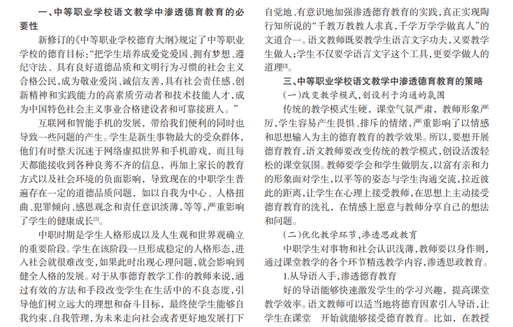 新课改要求以学生为主体推行素质教育,让每个学生都能够发展成为全面的人。德育是素质教育的重要组成部分,教师要做到既教书又育人,教学才算成功。随着网络的发展,手机和电脑中充斥各种良莠不齐的信息,中职学生相对于普通高中的学生来说,更加需要思想方面的正确引导。针对中职学生,如何做好德育教育,是摆在中职教师面前的一大难题。文章以新媒体背景下中职语文教育中如何有效渗透德育教育为目的,详细介绍了一些方法和策略,为中职语文学科的德育渗透提供了良好的切入点。