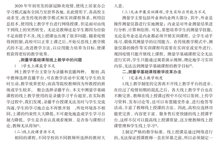 本文通过反思疫情期间线上教学的不足,改进了测量学基础课程的线上教学模式,以应用能力培养为目标,阐述了具体的实施方案,评价分析了实训效果及存在的问题。经过研究表明,改进后的线上教学方法可以取得更好的教学效果,能满足本实训课程大部分内容的要求,使学生真正掌握理论知识与实践技能,提升测绘工程专业人才的综合素质。