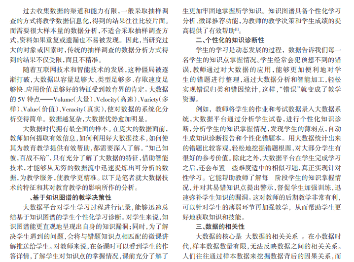 本文介绍大数据的相关特征,分析大数据技术对教学的作用,并对教师如何转变思维来迎接新技术进行讨论,以期为教育者在日常教学中使用大数据技术提供参考。