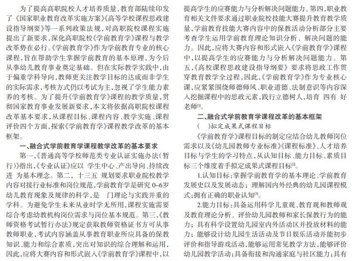 随着时代的发展,国家、社会、行业岗位以及学生都对高职院校人才培养提出了更高的要求。《学前教育学》作为学前教育专业的核心课程,对学生的专业发展具有重要的奠基作用。传统教学实践存在重理论、轻实践的倾向,忽视学生的学习需要、岗位需求以及综合能力的培养。因此,高职院校《学前教育学》课程改革应结合课程性质、岗位要求、教资考试大纲、职业技能竞赛的基本要求,深度挖掘课程思政元素,从课程目标、课程内容、教学实施、课程评价四个方面着手构建融合式学前教育学课程基本框架。