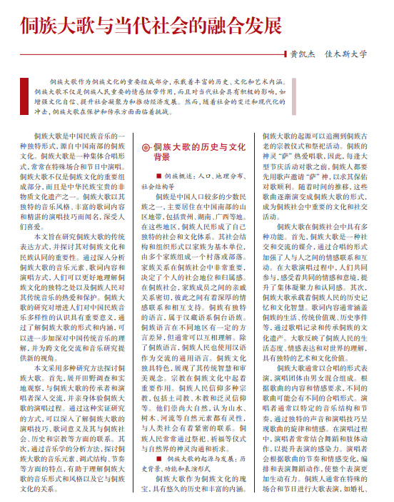 侗族大歌作为侗族文化的重要组成部分,承载着丰富的历史、文化和艺术内涵。 侗族大歌不仅是侗族人民重要的情感纽带作用,而且对当代社会具有积极的影响,如 增强文化自信、提升社会凝聚力和推动经济发展。然而,随着社会的变迁和现代化的 冲击,侗族大歌在保护和传承方面面临着挑战。