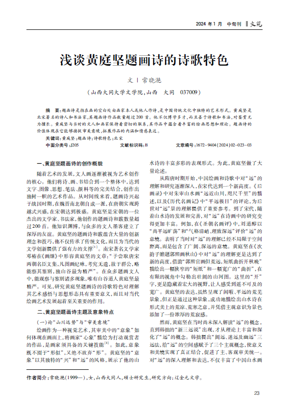 题画诗是指在画的空白处由画家本人或他人作诗,是中国传统文化中独特的艺术形式。黄庭坚是北宋著名的诗人和书法家,其题画诗作品数量超过200首。他不仅博学多才,而且善于诗歌和书法,对鉴赏尤为擅长。黄庭坚与当时的文人和画家保持着密切的联系,其作品中蕴含着丰富的绘画思想和理论。题画诗的价值体现在它能够捕捉审美意境,拓展作品的内涵和情感表达。
