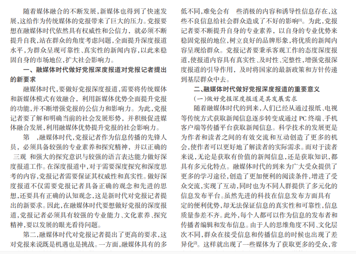 融媒体时代,群众获取新闻信息的渠道更加广泛,获得的新闻内容也更加丰富,对党报的发展产生了巨大的影响。党报要想在新时代背景下,做好深度报道,提升自身的权威性和公信力,需要通过精选报道选题、策划报道内容、重视个性化传播等方式实现。