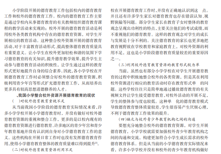 许多小学学校在开展德育教育的过程中,并没有充分地利用好校外的德育教育资源。这就使得小学阶段德育教育工作的整体教育质量难以达到理想水平。而校外的各类德育教育资源,对于提升小学阶段的德育教育质量具有非常重要的意义。因此,各小学学校应当充分利用好各类校外资源开展德育教育活动,创新优化德育教育的模式,从而有效地提高德育教育的质量。