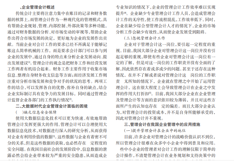 在市场经济不断发展的大环境下,企业想要站稳脚跟、实现稳步发展,就需要不断提升自身核心竞争力,加强管理会计培训,储备专业的管理会计人才,将现代化信息技术和企业管理会计相结合,将管理会计有效运用到企业内部管理中,从而更好地促进企业可持续发展。