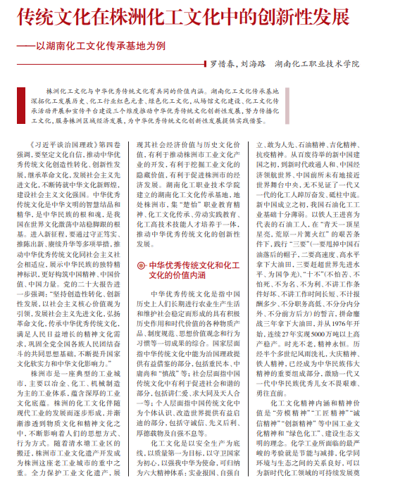 株洲化工文化与中华优秀传统文化有共同的价值内涵。湖南化工文化传承基地 深拓化工发展历史、化工行业红色元素、绿色化工文化,从场馆文化建设、化工文化传 承活动开展和宣传平台建设三个维度推动中华优秀传统文化创新性发展,努力传播化 工文化,服务株洲区域经济发展,为中华优秀传统文化创新性发展提供实践借鉴。