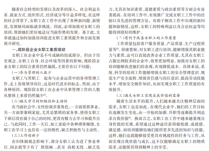 女职工队伍在新形势下发生深刻且巨大的变化,已经成为企业员工中不可或缺的一部分,从某种程度上说,她们是推动各项建设以及企业改革发展的主力军。因此,加强对女职工的培训,以此提升其综合素质,对于促进女职工全面发展以及企业的可持续发展有重要意义。基于此,本文阐述了培训女职工的几点措施,包括加强理想信念教育、企业形势教育、法律法规教育以及知识技能教育。