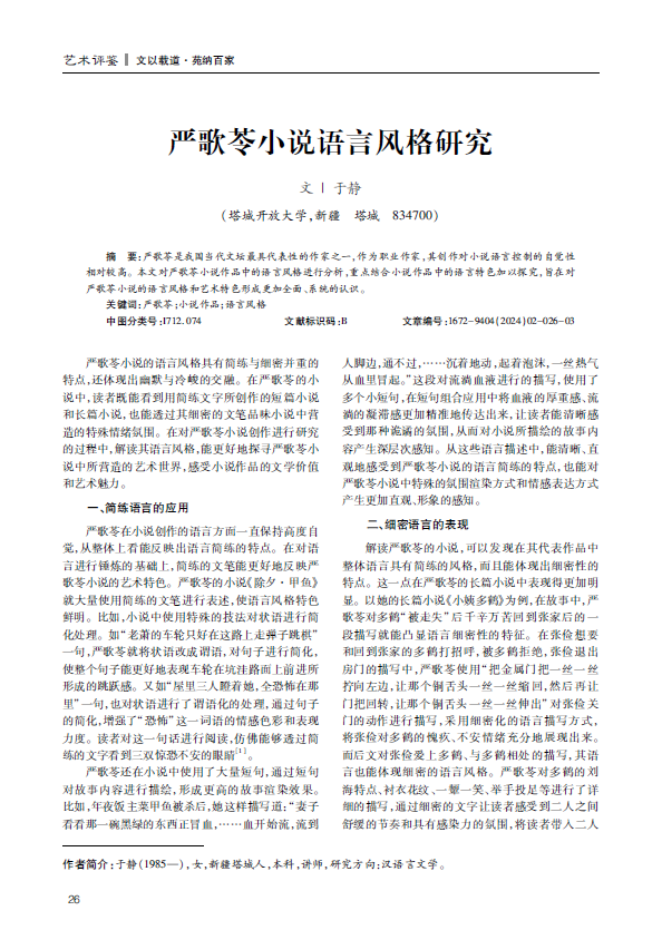 严歌苓是我国当代文坛最具代表性的作家之一,作为职业作家,其创作对小说语言控制的自觉性相对较高。本文对严歌苓小说作品中的语言风格进行分析,重点结合小说作品中的语言特色加以探究,旨在对严歌苓小说的语言风格和艺术特色形成更加全面、系统的认识。