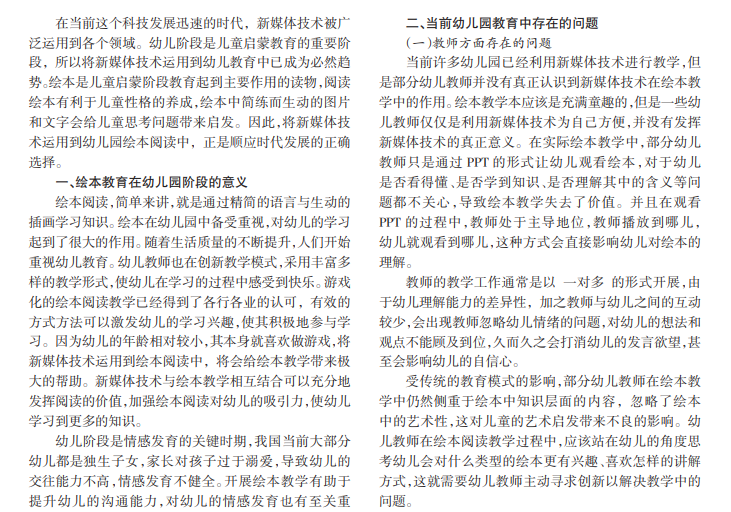 新媒体技术在实际生活中的应用打破了传统信息交互的束缚,改变人们交流习惯的同时也丰富了人们的生活方式。随着时代的发展,我国对教育的改革不断深入,对幼儿教育越来越重视。绘本是当前全世界最流行的儿童读物,对儿童的教育意义深远。本文将研究分析新媒体技术在幼儿园绘本阅读中的实际应用。