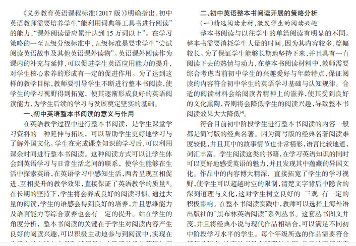 当前,随着素质教育的不断深入,教师逐渐转变自身的教学理念,开始注重对学生学习兴趣及学习能力的培养。在初中英语教学过程中,教师开始尝试运用整本书阅读教学模式。这种教学模式对学生阅读习惯的养成有一定的促进作用,使学生可以在阅读过程中不断摸索与总结阅读方法及阅读经验,促进自身的英语综合素养得到显著提升。在初中英语整本书阅读的实践教学中,教师需要围绕学生的学习兴趣合理地筛选,并且探索有效的教学策略,保证英语教学可以取得良好的教学效果。