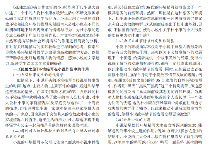 环境描写是小说的三大写作要素之一,小说里的环境描写不同于实际生活中的环境,主要分为对自然环境的描写和对社会环境的描写,但都是为塑造小说中典型人物形象而特意设置的能够高度概括人物与环境间关系的典型情境,以此来丰满小说人物角色的形象。因此,教师应该对小说环境描写的教学引起重视,通过环境描写的教学帮助学生更好地解读课文,理解课文背后所蕴含的深厚含义。