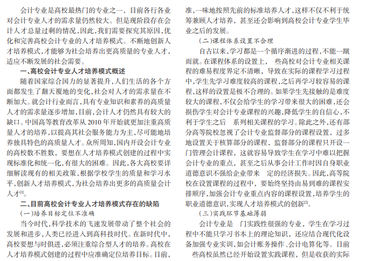 随着社会的飞速发展,当今时代对高质量人才的需求不断增强。人才培养的质量很大一部分取决于人才培养模式的质量,高校会计专业也不例外。本文分析了目前高校会计专业人才培养模式存在的缺陷,并有针对性地提出了相应的创新举措,旨在为相关人员提供新的创新思路。