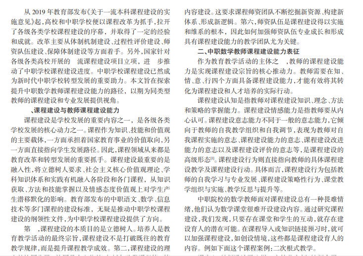 课程建设的目的是立德树人,对课堂教学具有明显的导向性。中职数学教师的课程建设能力表现在四个方面,分别是认知、情感、意志和行为。提升中职数学教师课程建设能力,宏观上需要国家的政策予以保障、学校教研机制的良好运行,微观上需要教师具有课程建设能力学习自觉。