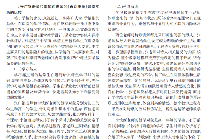 一般来说,语文课堂教学分为三个基本层面:课堂教学设计、课堂教学实施和课堂教学评估。对应这三个层面,学情分析主要包括学生在课堂学习时的学习起点、学习状态和学习结果这三大要素。本文主要从这三大要素出发,对张广银老师和李镇西老师的《再别康桥》课堂实录做一个简要的比较分析,通过分析,探索中职语文教学策略。