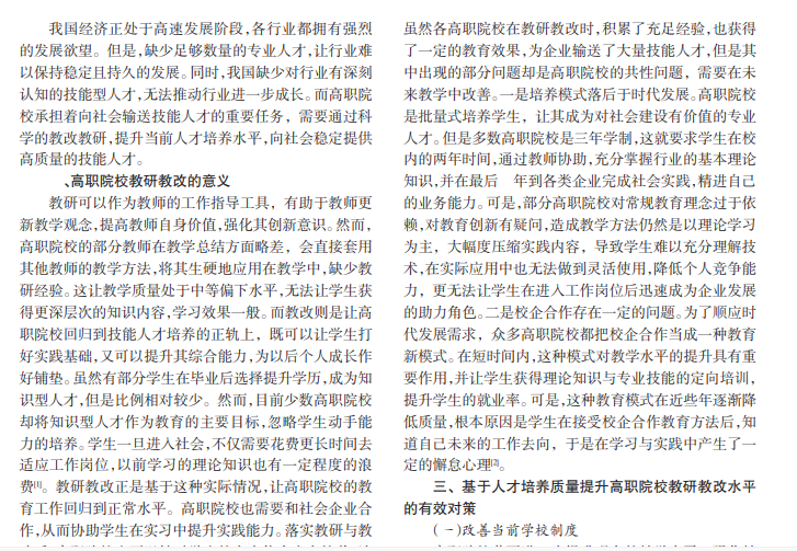 作为高职院校良性发展的重点,人才培养在保证数量的同时,也要逐渐提升质量。尤其是向社会输送具有较强专业性技能人才的高职院校,更要为人才的未来成长负责。本文以提升人才培养水平为目的,提出若干条提升高职院校的教改教研质量的有效对策,旨在为更多高职院校提供教学思路,让更多专业人才参与到国家建设中来,为我国未来发展贡献力量。