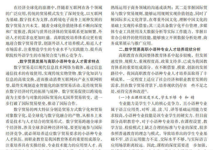 数字贸易背景下,只有明确高职院校小语种专业人才需求特点,认清高职小语种专业人才培养现状,才能有效进行“供给侧”改革。本文提出创新高职院校小语种专业人才培养模式,构建“一核、两翼、三驱动”的培养机制,即以专业素养提升为核心,以校企合作、产教融合为“双翼”,以国际合作、政府激励、平台培养为“三轮驱动”,创新育人模式,提升育人质量。