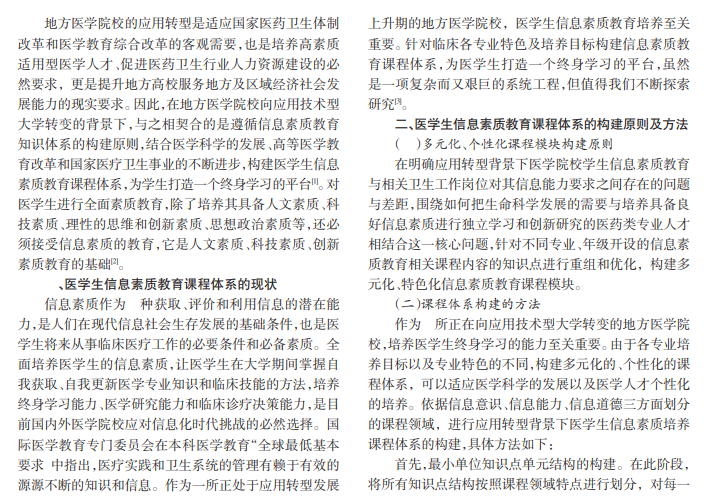 本文针对地方医学院校在转型发展的背景下信息素质课程开设的现状,围绕如何把生命科学发展的需要与培养具备良好信息素质进行独立学习和创新研究的医药类专业人才相结合这一核心问题,研究医学生信息素质教育课程体系构建的新理念、新内容和新方法;研究全面提高医学生信息素质为目标的多元化、特色化信息素质教育课程体系构建的目标、原则、标准和具体实施方法;研究如何打造一个将信息意识、信息能力、信息道德三方面有机结合的终身学习平台;研究为同类型医学院校提供相关借鉴经验。