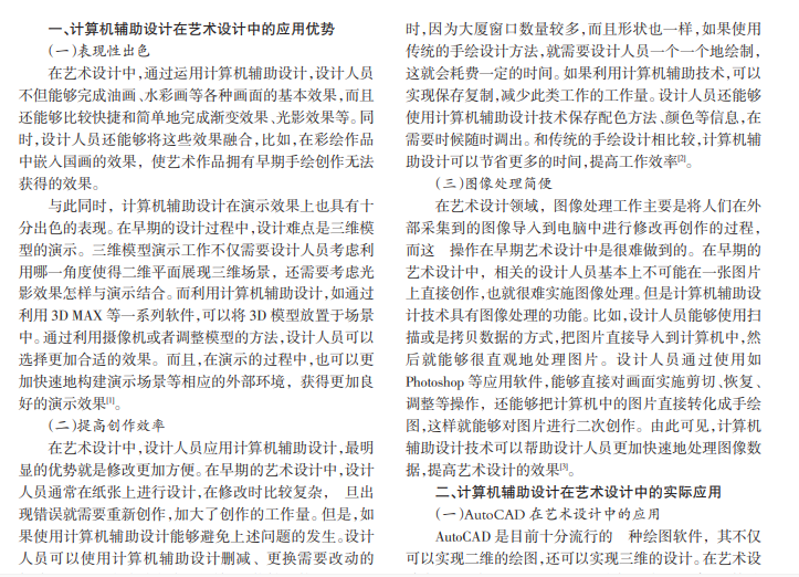 随着科学技术的不断进步与发展,计算机已经逐渐走进我们的日常生活与工作中。计算机能够更加方便、快捷地实现设计人员的设计思路,在艺术设计领域,设计人员对计算机辅助设计的应用更加广泛。与其他设计手段相比,计算机辅助设计具有强大的优势,成为艺术设计工作人员的一种重要设计工具,从而推动艺术设计的进步。