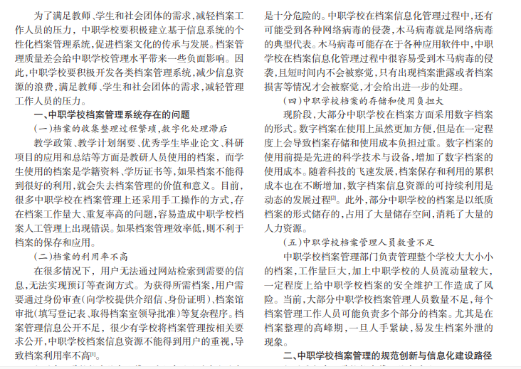 近年来,我国信息技术发展迅速,云计算、云存储技术等快速发展并得到广泛应用,中职学校档案管理工作迎来了新的挑战。目前,各中职学校高度重视档案管理工作,并根据学校的具体情况,制订了档案管理的相关规定。中职学校档案管理规范化建设与信息化建设越来越重要。