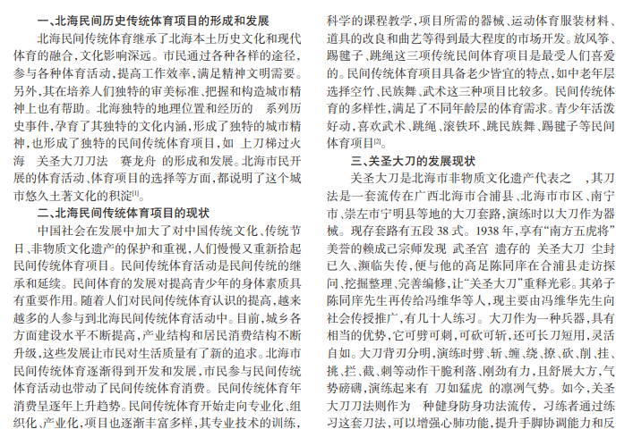 民间传统体育是历史文化的重要组成部分,其休闲、娱乐、健身等功能价值在全民健身中有重要作用。北海是国家历史文化名城,北海民间传统体育活动已成为市民生活的一部分。本文运用了逻辑分析法、文献资料法、数理统计法、问卷调查法及访谈法,从历史文化的视域,以关圣大刀项目作为载体,对北海民间传统体育项目现状及发展等进行深入研究,总结归纳北海民间传统体育项目发展的规律。本项目的研究目标是借助以上所述,在新时代、新机遇、新挑战之下,充分开发利用“历史文化”的文化效应和经济效应,更好地推动北海经济的繁荣,为北海发展打开更大的空间。