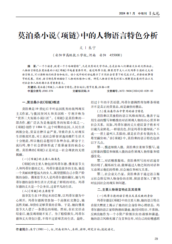 一千个读者,就有一千个哈姆雷特”,凡是优秀的文学作品,总是会给人们解读文本的无限机会。人物语言特色在莫泊桑的小说《项链》中起着重要作用。通过玛蒂尔德、佛莱思节夫人以及玛蒂尔德的丈夫的语言特点,可以推断他们的身份和地位。该小说中的对话也揭示了不同社会背景下的交流方式,并推动故事情节的发展。同时,语言特色帮助描绘了人物的性格和心理。研究人物语言特色对深入理解莫泊桑的作品以及对社会和人性的揭示具有重要意义。