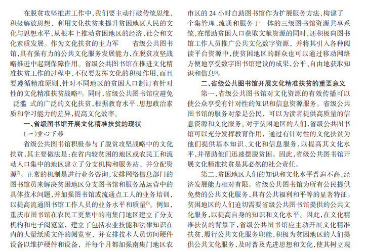 省级公共图书馆是我国公共文化服务体系的重要组成部分,是公众获取信息和知识资源的重要场所,在公共文化服务建设中发挥着重要作用。近年来,有关部门越来越重视文化精准扶贫,省级公共图书馆的文化精准扶贫工作也取得了不错的成绩。但是,随着时代的发展和科学技术水平的提高,省级公共图书馆迫切需要创新文化精准扶贫战略,以提高文化精准扶贫的有效性。
