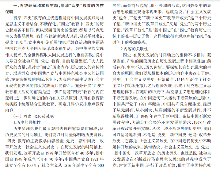 以史鉴今、资政育人,在党的领导下,中华民族在改革开放和社会主义现代化建设中取得良好的成绩。实践历程中,马克思主义思想与中国实践的结合证明,中国共产党所走的道路是正确的,这也是“四史”教育发展的主线内容。我们在开展“四史”教育的同时,要融会贯通当前时代发展前景,分析主题教育的主线内容,理清“四史”教育的内在逻辑,揭示内在发展实质,促进中华民族的伟大复兴。