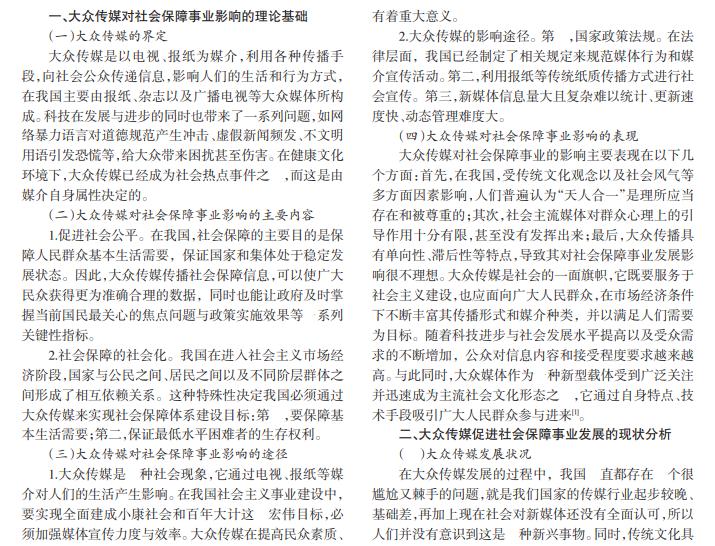 随着社会的进步和经济文化的发展,人们对信息传播有了越来越高的要求。目前,大众传媒已经成为公众接收外界新闻、了解国家大事、参与政治等活动中不可缺少的重要工具。大众传播是指以一定媒介作为载体,向外传播信息的活动。大众传播具有双向性、广泛性和快速等特点。在新媒体时代,人们获取信息越来越快捷。发展传播学视角下的大众传媒为公众提供了便捷、多样和全面的社会信息服务,在满足公众文化需求,促进国家公共事业健康有序发展方面起到了重要作用。随着我国经济快速增长与人民生活水平的不断提高,人们对精神文明的关注越来越多。而社会保障作为民生保障内容之一,已经被广泛接受并成为广大民众最关心的话题之一。