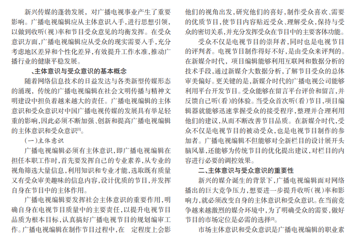 在互联网技术发展和信息技术革命的带动下,各类新媒体形态层出不穷,给广播电台等传统媒体的编辑管理工作带来了极大挑战。在新媒介环境下,广播电视节目编辑应当重视对自身市场主体意识和广大受众意识的研究、创新以增强整体效果。本文首先论述了广播电视节目编辑的社会主体性和广大受众意识,之后剖析了广播电视节目编辑中存在的问题,最后给出了新媒介环境下增强广播电视节目编辑的市场社会主体性和广大受众意识的具体对策,期望给相关人员带来一定的借鉴价值。