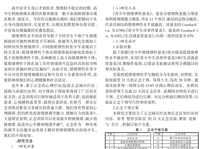 本研究通过设计 21天正念干预方案,对高中生的情绪弹性水平进行训练,并对比方案干预前后的情绪弹性水平,结果发现:(1)高中生的情绪弹性水平总体处于中等偏上的水平;高中男生的积极情绪能力和情绪恢复能力显著好于高中女生。(2)正念训练作为一种有效的调节方式,可显著提高高中生的情绪弹性水平。