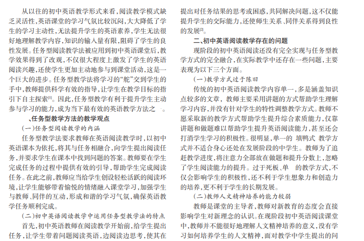 阅读教学指对课内、课外文章的教学。阅读教学一方面能够让学生掌握阅读方法和技巧,另一方面可以让学生在精神与情感上获得感悟。随着时代的发展,任务型教学法更适用于初中英语阅读教学。本文从初中英语阅读教学的内涵与特点出发,分析初中英语教学的问题,然后探讨任务型教学的原则,解析如何在英语阅读教学中更好地运用任务型教学法。