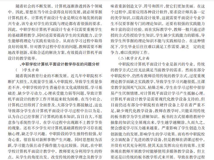 当今社会,计算机平面设计的应用领域十分广泛,其主要被用于广告设计、影视制作、网页制作等方面。目前,各企业十分重视自身产品的推广及宣传,对计算机平面设计人才的需求量也随之增加。中职计算机平面设计专业可以为社会培养计算机平面设计人才。随着企业对人才的要求越来越高,计算机平面设计教学方面的质量要求也随之升高。为了培养高素质的技能型人才,使学生在步入社会参加工作后,符合企业发展所需人才标准,分析计算机平面设计基础课程教学中存在的问题是非常有必要的。中职学校要做好教学改革工作,为社会培养更多高素质的技能型人才。本文分析中职学校计算机平面设计教学存在的问题,并提出相关的教学策略。