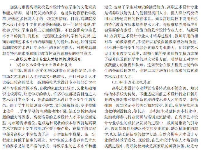 随着艺术设计行业的飞速发展及其规模的扩大,高职艺术设计专业逐渐成为热门专业。高职艺术设计教育应该与当前社会的文化、经济和市场背景等方面相结合,保证高职院校培养的人才能满足社会的需求。本文主要针对高职艺术设计专业的人才素质与能力培养进行分析与探究。