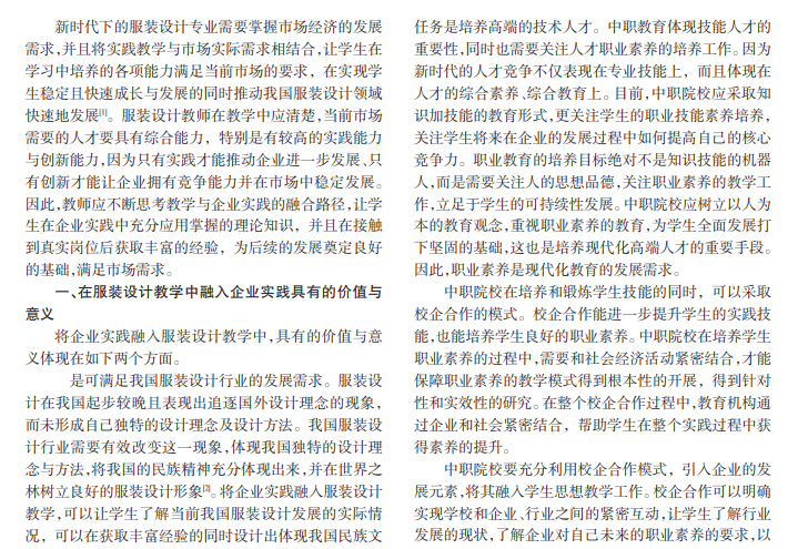 在我国市场经济快速发展的背景下,社会对教育领域提出了改革人才培养模式的要求。服装设计专业要根据当前的教育要求及人才需求标准构建有效的人才培养体系。教师在教学中要注重实践教学,以提升学生的实践能力,同时获得丰富的经验。服装设计教学要积极地与企业合作,充分发挥企业实践的作用,以提升人才培养效果。如何实现服装设计教学与企业实践有效融合这一目标,需要教师不断深入地研究,并构建具体的融合路径。