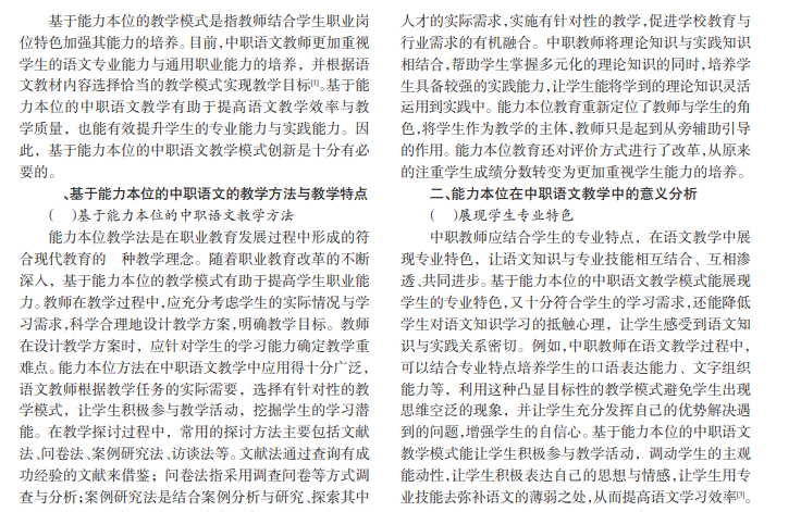 在中职教育过程中,语文教学是培养学生语文能力和综合职业能力的必要途径。但从当前实际情况来看,我国职业教育更加注重学生专业能力的培养,对语文、数学等文化课程的教学不够重视。大量的实践研究表明,基于能力本位的中职语文教学对学生未来发展有重要作用。因此,本文从基于能力本位的中职语文的教学方法与教学特点入手,简单阐述了能力本位在中职语文教学中的重要意义,并针对能力本位在中职语文教学中存在的问题,提出了行之有效的创新策略,希望能为中职语文教育带来一定的帮助。