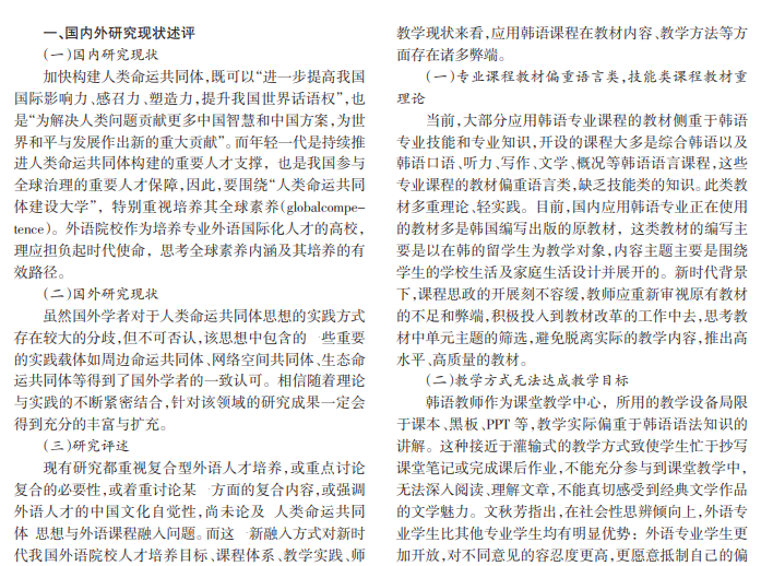 人类命运共同体理念为应用韩语专业课程建设提供了新的机遇和挑战。在课程建设上,韩语专业应顺应时代发展浪潮、立足国家战略部署、迎合市场发展需求,进一步寻求有质量、有效果、有动力、有后劲的改革方案,培养具有文化传播能力、国际战略分析能力、经济社会研究能力,兼顾全球化综合素养的“多语言 +”型人才。