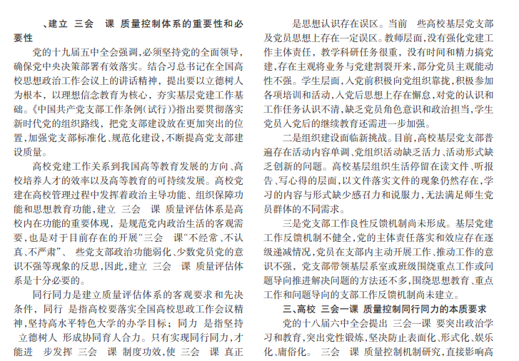 严肃党内政治生活是全面从严治党的根本性基础工作,是全党的重大任务。高校基层党组织“三会一课” 质量的提升关系到组织生活的规范化与制度化。本文深刻剖析目前“三会一课”存在的问题根源,结合高校“三会一课” 质量评估同行同力的本质要求,分别从发挥教师思想工作主渠道作用、形成协同育人机制和建立健全的控制与反馈机制三个方面提出实现路径,使“三会一课”真正成为党员政治学习的阵地、思想交流的平台、党性锻炼的熔炉。