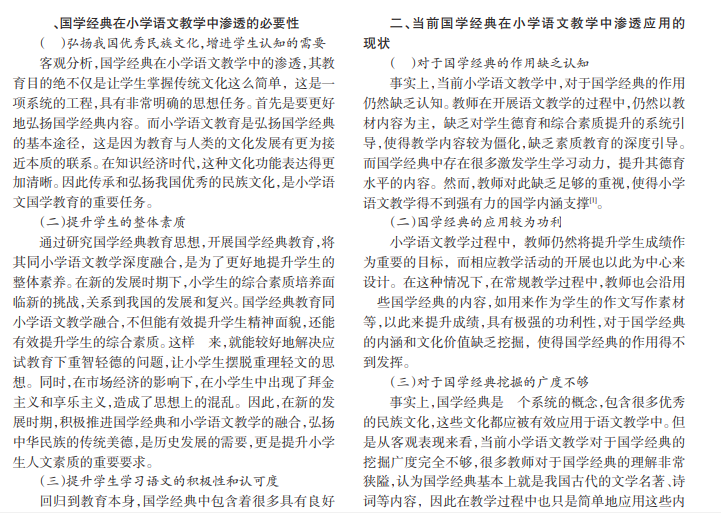 国学经典是我国传统文化中最精华的内容,是中华民族文化重要的精髓,是融合了五千年发展历史的重要文化根基。在当前小学语文教学中融入国学经典,符合我国新时期素质教育的需要,具有重要的意义。文章以此为出发点,深入分析了国学经典在小学语文教学中的渗透方案。