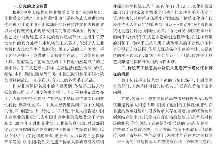 本文从传统手工技艺类非物质文化遗产的理论和现状出发,通过对传统手工技艺类非物质文化遗产市场化实践经验的探索,挖掘目前理论研究的缺失和市场化过程中出现的问题。在当前的市场环境下,要实现对传统手工技艺类非物质文化遗产的保护和发展,必须发挥非遗传承人文化的主体性作用,推动非物质文化遗产中传统手工技艺的继承、保护和开发,为其创造市场发展的条件,通过构建社会公共文化服务机制使其获得内生发展动力,进而为传统手工技艺类非物质文化遗产市场化的保护和发展铺平道路。